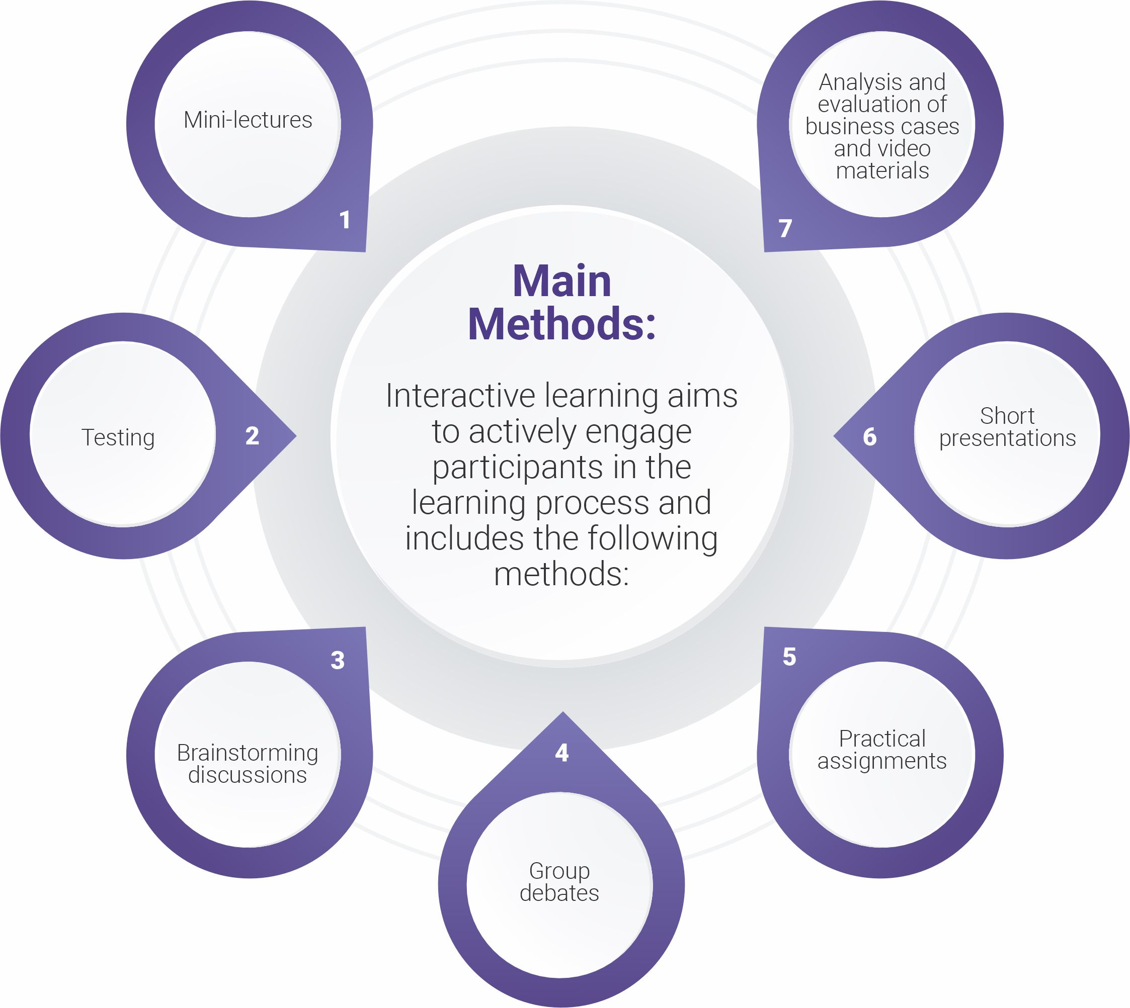 Interactive training (active involvement of participants in the learning process), mini-lectures, testing, brainstorming, group discussions, practical tasks in small groups, mini-presentations, analysis of business cases and videos. The module is based on interactive methodology – active involvement of participants in the learning process. Guest speakers/experts and business professionals are invited to each course.
